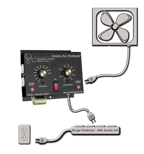 The CT-DH-1 operates on 120 Volt AC with 15 amp maximum switching capacity and is intended for indoor use only. Be sure to locate your atmospheric controller where it will accurately sample and respond to the average air conditions. Good air circulation around the controller and in your garden space is essential. Avoid locating the controller in a draft or in direct sunlight.