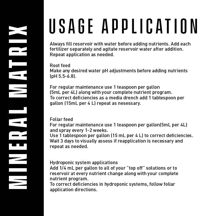 Organic micronutrient supplement formulated to correct deficiencies for all organic crops, hydroponics systems, container plants and landscapes. Citric acid chelated for stability and availability and improved plant uptake. Safe and natural, non-phytotoxic formula. Highly effective as a foliar spray or watered in to soil, soilless or hydroponic root zone applications. Nothing quite like this has ever been available before.