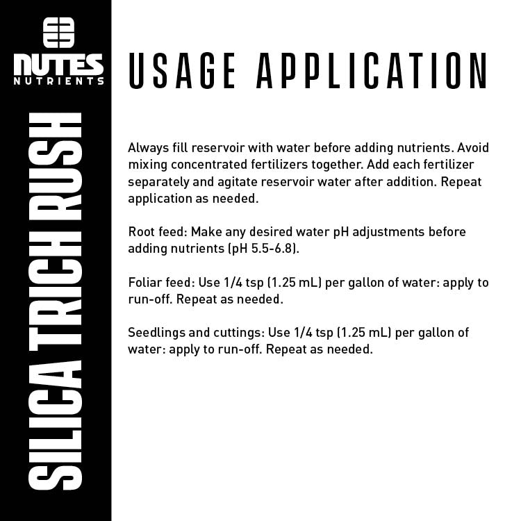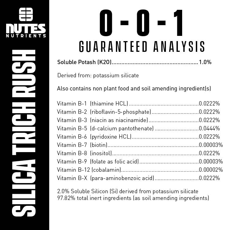 Silica Trich Rush is a balanced mix of potassium silicate, 10 b-vitamins, and coriander flower extract (for product fragrance). This combination promotes nutrient uptake, strengthens cell wall structure, and builds a stronger plant which benefits root formation and bud development.